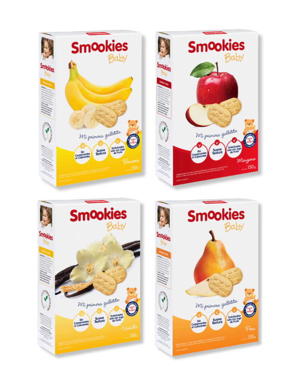 Endulzadas solamente con jugo de uva orgánico, Smookies Baby es una papilla de frutas y cereal convertida en galletita, la opción más saludable para los bebés, porque es la única creada junto a pediatras y expertos en nutrición teniendo en cuenta sus necesidades en esta etapa de crecimiento.